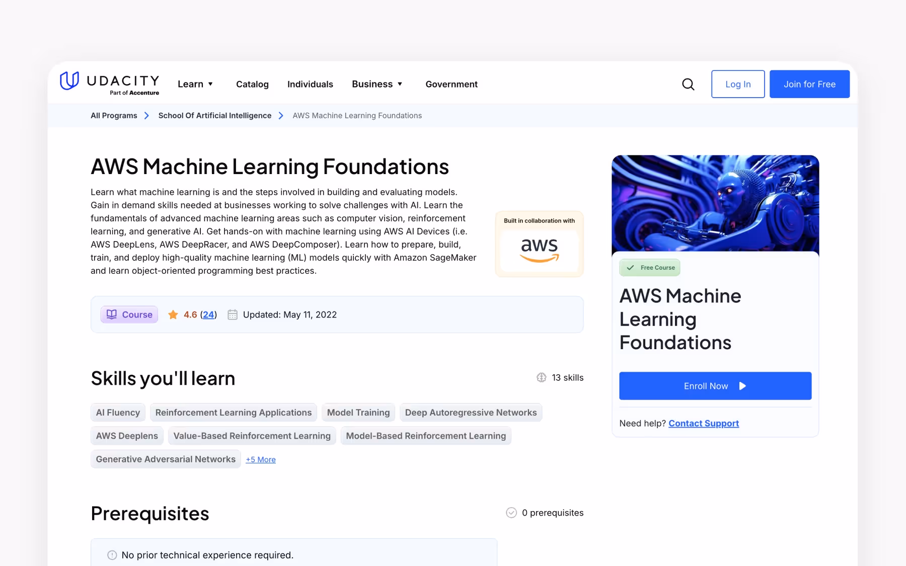 The Machine Learning Foundations Course from AWS, in partnership with Udacity, is a free online program created to introduce learners to the core concepts of AI and ML. Originally part of AWS's scholarship program, this course remains available to the public for free and includes hands-on labs, quizzes, and video instruction.