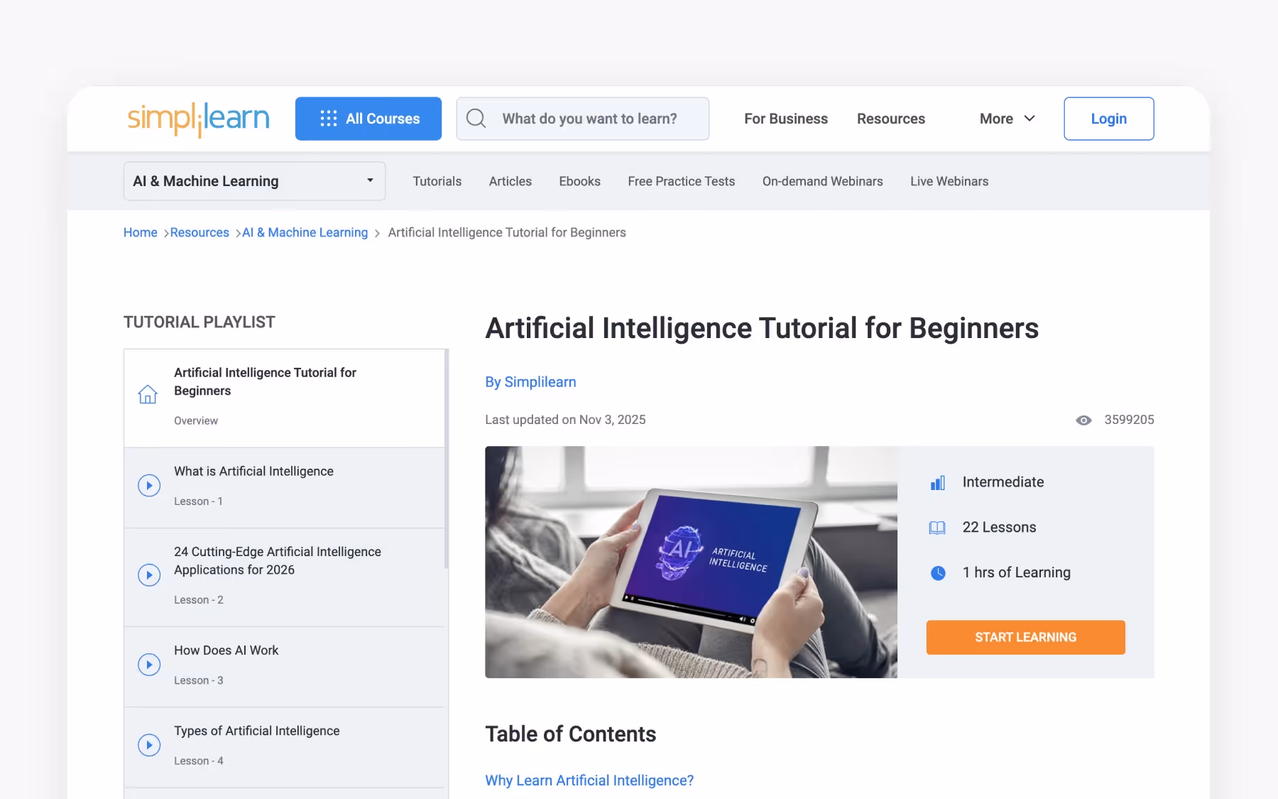 Simplilearn’s “Artificial Intelligence for Beginners” is a free foundational course designed for learners who want a quick, accessible introduction to AI concepts. It’s part of Simplilearn’s SkillUp initiative, which offers free training in various digital skills, including cloud computing, AI, data science, and more. The AI course includes approximately one hour of self-paced video lectures and requires no technical background to begin.