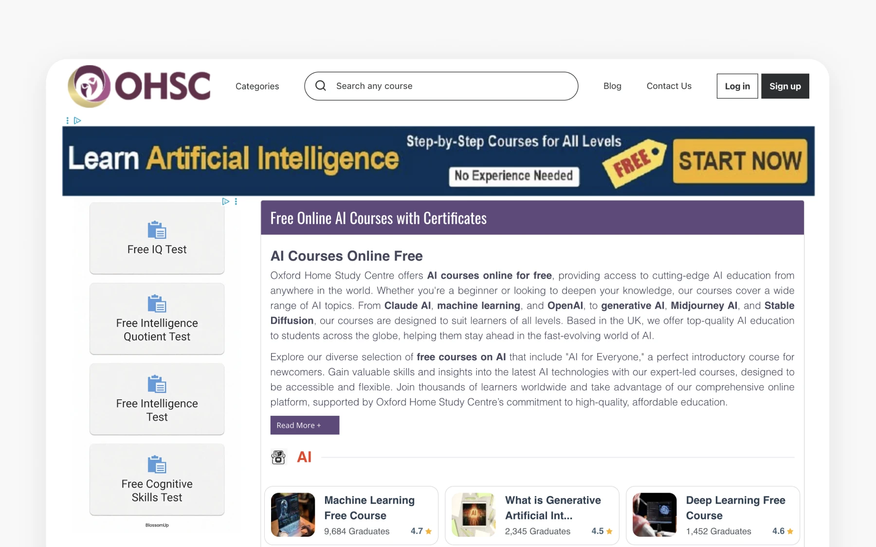 Oxford Home Study Centre (OHSC) offers completely free online courses in Artificial Intelligence that serve as a basic introduction to the field. Unlike university-backed programs, OHSC operates as a private distance learning provider, yet it has gained attention for its accessible, no-cost courses that come with the option to purchase a certificate of completion. The AI course introduces foundational concepts without overwhelming learners with complex technical material.