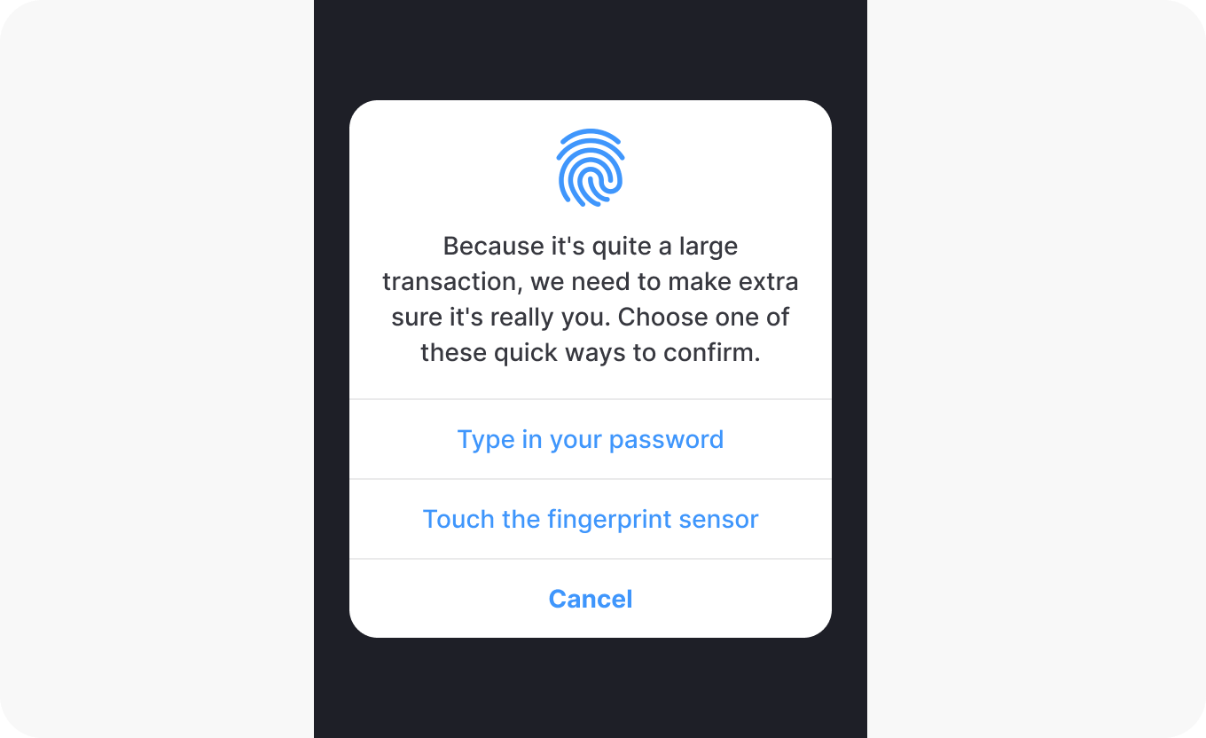 - Double authenticate before significant actions: Requiring re-authentication, such as entering a password or providing a fingerprint, before executing sensitive actions like money transfers adds an extra layer of security, ensuring that users are intentionally taking the action.