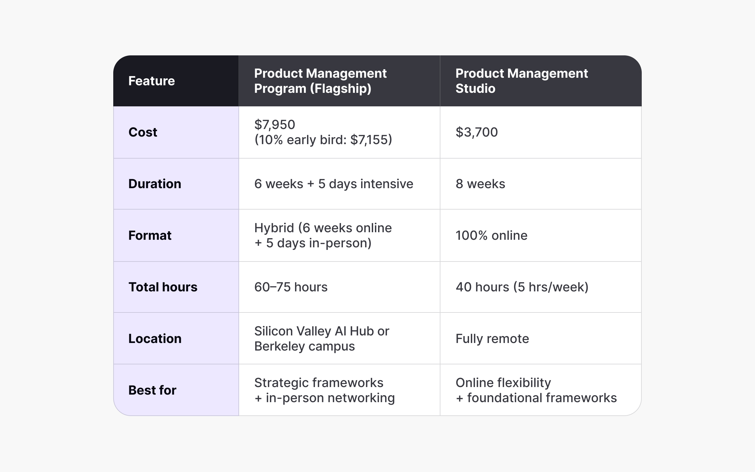 What matters: The flagship targets experienced PMs who want strategic frameworks plus the Berkeley name on their LinkedIn. The Studio? It's for earlier-career professionals building foundations or making the jump from design, marketing, or engineering.