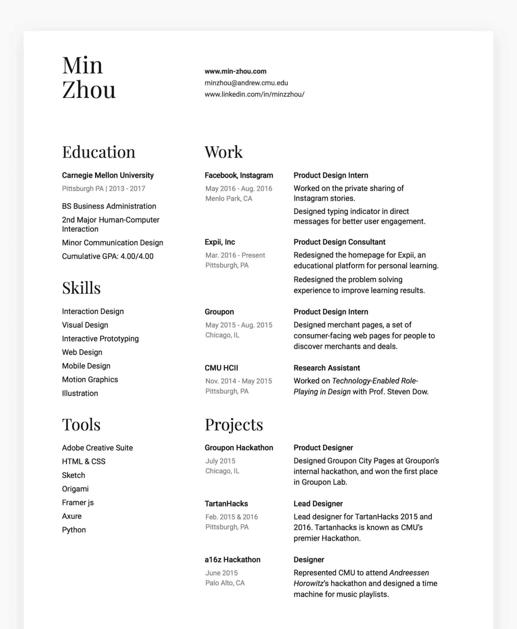 Key takeaways from this UX design resume: this is a clear, to-the-point resume that demonstrates experience in the industry. It’s easy to read and to navigate—no fuss. The concise format also helps save space, making the resume more efficient and easier to read.