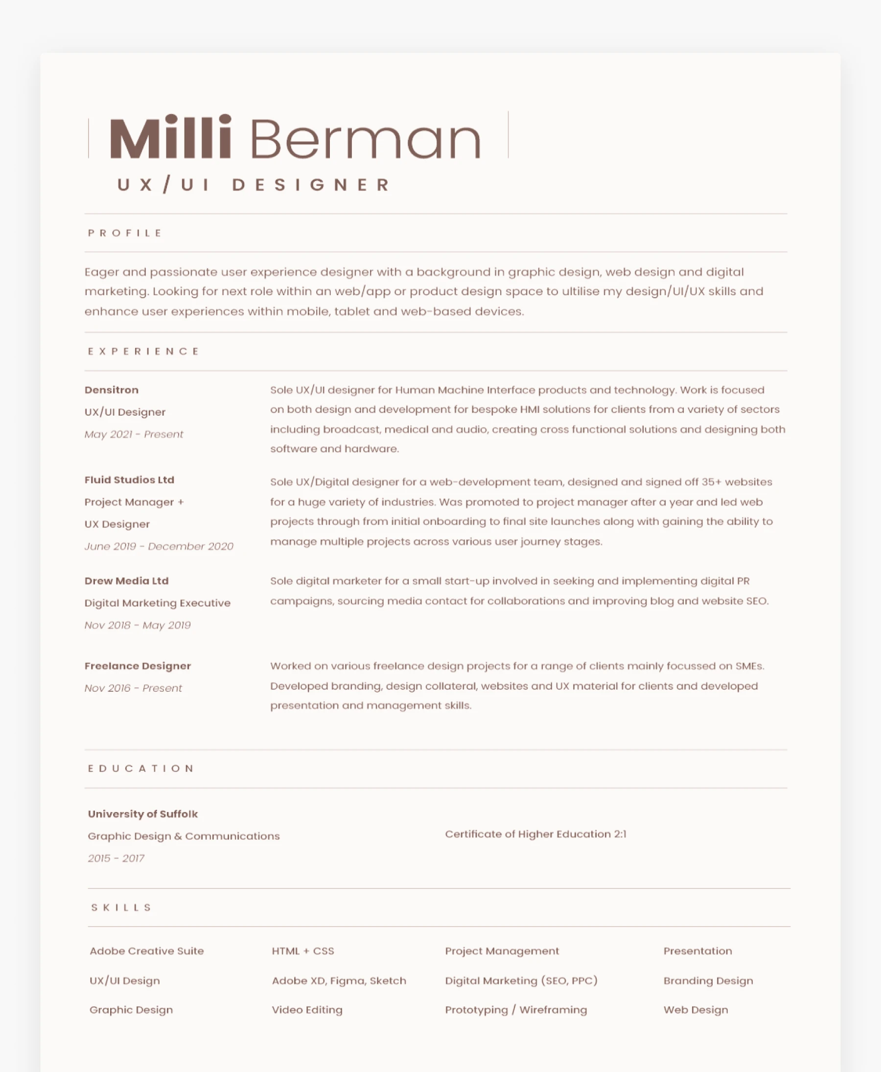 A UX designer resume is a concise document detailing a designer’s experience, technical skills, education, and more. It’s a document designed to convince a hiring manager why you’re a great UX designer. A resume is usually accompanied by a cover letter and a portfolio showcasing your best UX skills. Be sure to include a link to your online portfolio or dedicated portfolio website on your resume, as this allows hiring managers to easily review your work and assess your capabilities.