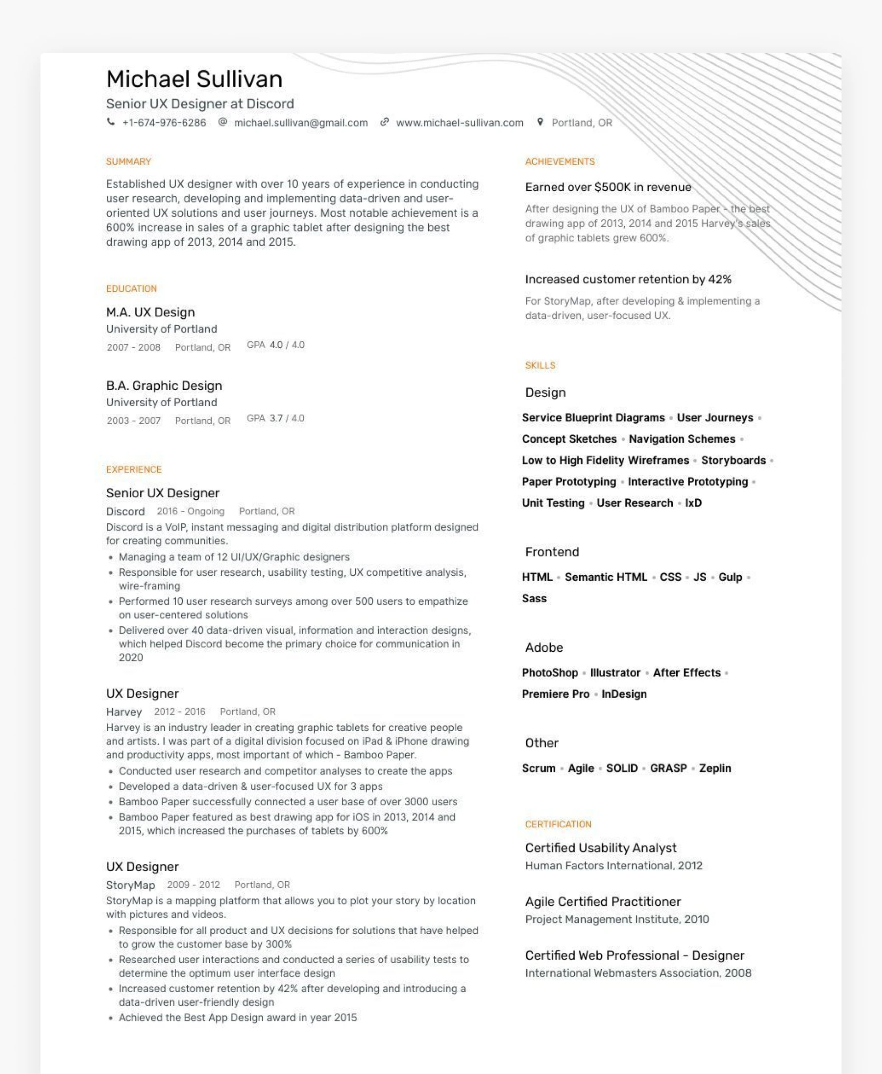 Keep these central goals in mind when creating your UX designer resume, and remember to gear every single detail towards getting these across. Understanding the hiring process and how resumes are evaluated at each stage can help you tailor your resume to pass through initial screening stages. Now we’ve been through some of the details, let’s dive into some UX designer resume examples to help inspire your own UX designer resume.
