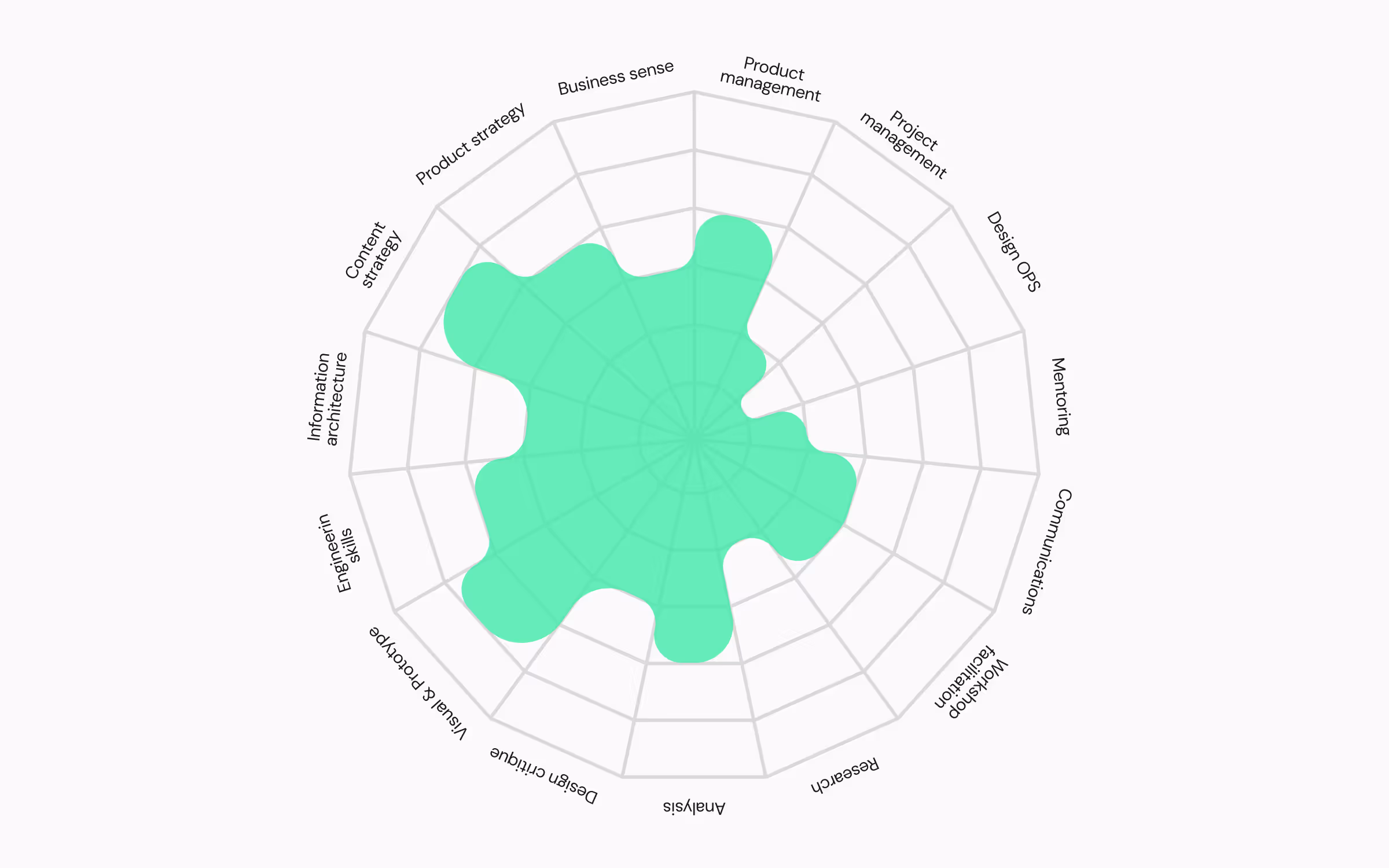 UX designer skills are ideal for this type of visualization. The skills (and skill gaps) can be translated into a skill graph to highlight the areas where a designer excels and areas that need development.