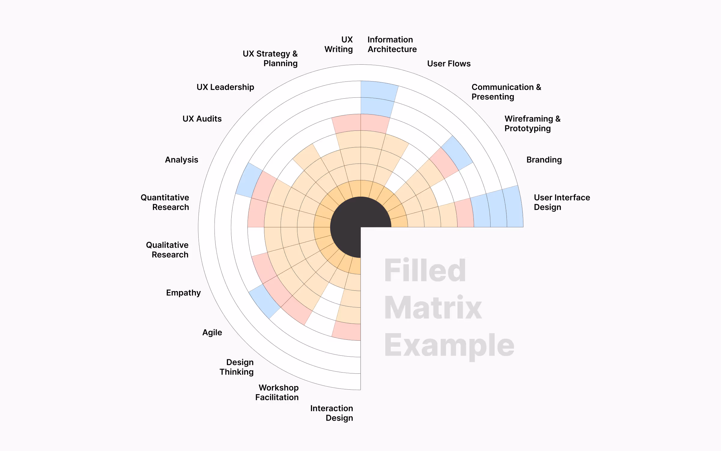 To create an effective skill map, you need to identify the key skills to track. The core skills of UX designers are: