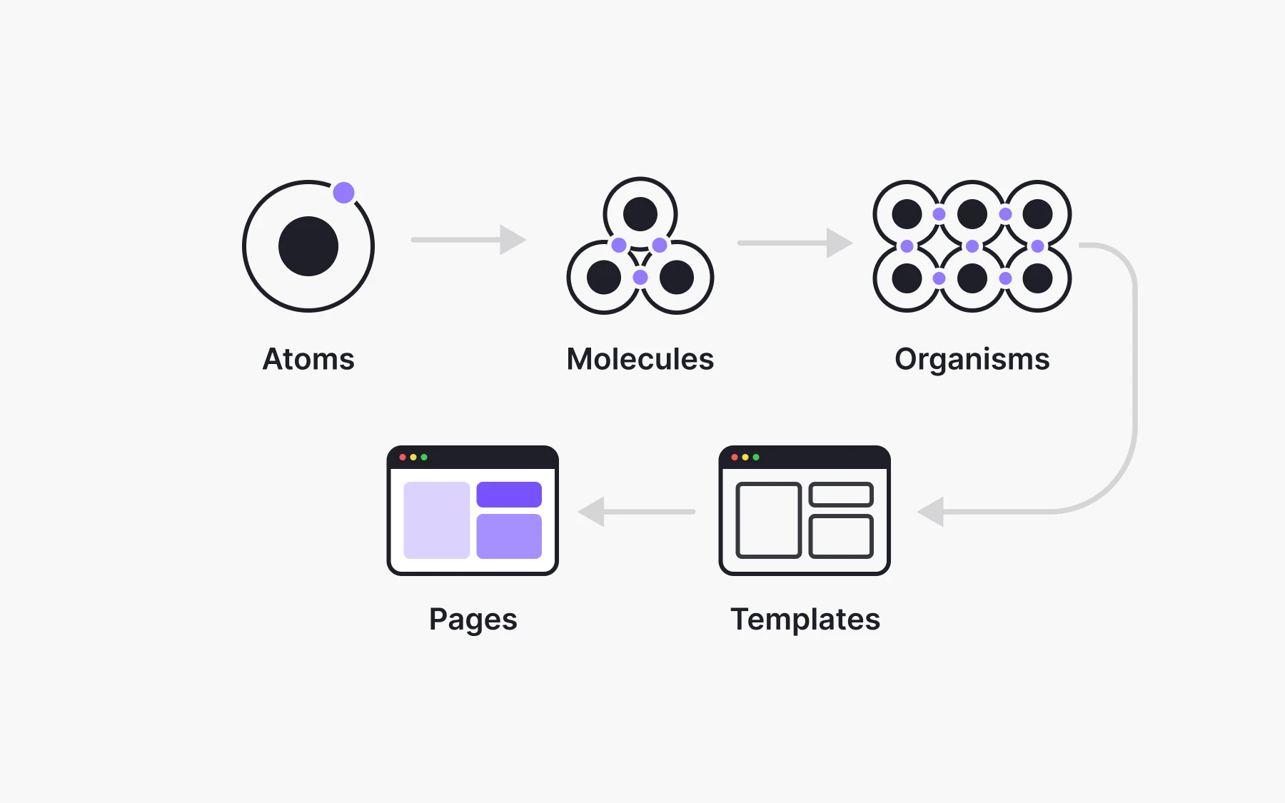 - Molecules: Just like how bricks combine to form a wall, atoms combine to form molecules. A molecule might be a form label with a search input and a button, creating a search bar.